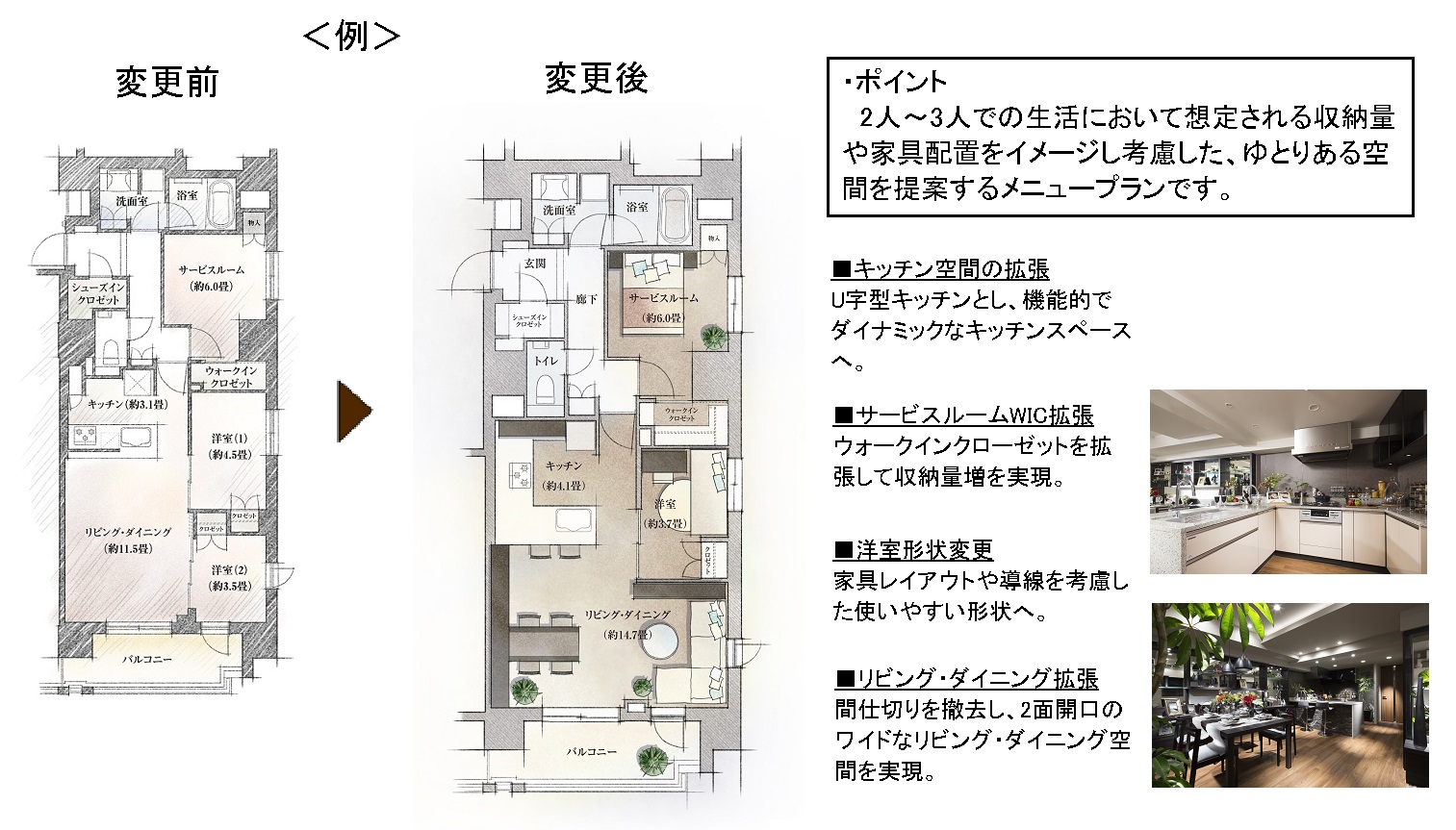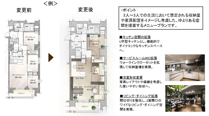 昨今、 情報化社会が進む中で、 こだわりを持ったDINKSだけでなく、 ファミリーやシングル、 シニアに至るまで、 ライフスタイルの多様化が一層進んでいるように見受けられます。 実際に、 ある程度個人が自由に空間をつくることができるリノベーション住宅やDIYなども流行しています。 当社で設計変更を対応させていただいた物件でも、 収納や水回り・電気設備の変更を希望されるお客様が以前より多くいらっしゃるように感じています。 しかし、 設計変更では期限が限られていたり、 高コストとなってしまう懸念があります。 そんな中で、 今回開発した“Life Style Plan”は、 通常のメニュープランの枠に捉われない、 お客様の暮らし方に沿ったご提案メニュープランになっています。 例えば、 「料理好きでキッチンをとにかく充実させたい」「部屋数は多くいらないけれど、 LDも居室も広く利用したい」など、 本物件に住まわれる一人一人のライフスタイルに合ったプランがきっと見つかると思います。 収納の変更等、 その他のメニューと合わせ、 本システムを通じて、 お客様がお住まいになられる空間づくりのサポートをさせていただきます。