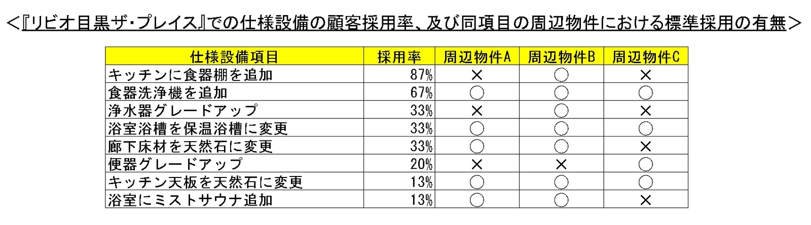 1.『リビオ目黒ザ・プレイス』の仕様設備の採用率と周辺物件において標準採用されている使用設備との比較