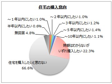 住宅の購入意向は3割弱、 「時期はわからないがいずれ購入したい」が22.3%を占めます。 購入意向者は、 20代では5割弱、 賃貸居住者では4割強みられます。