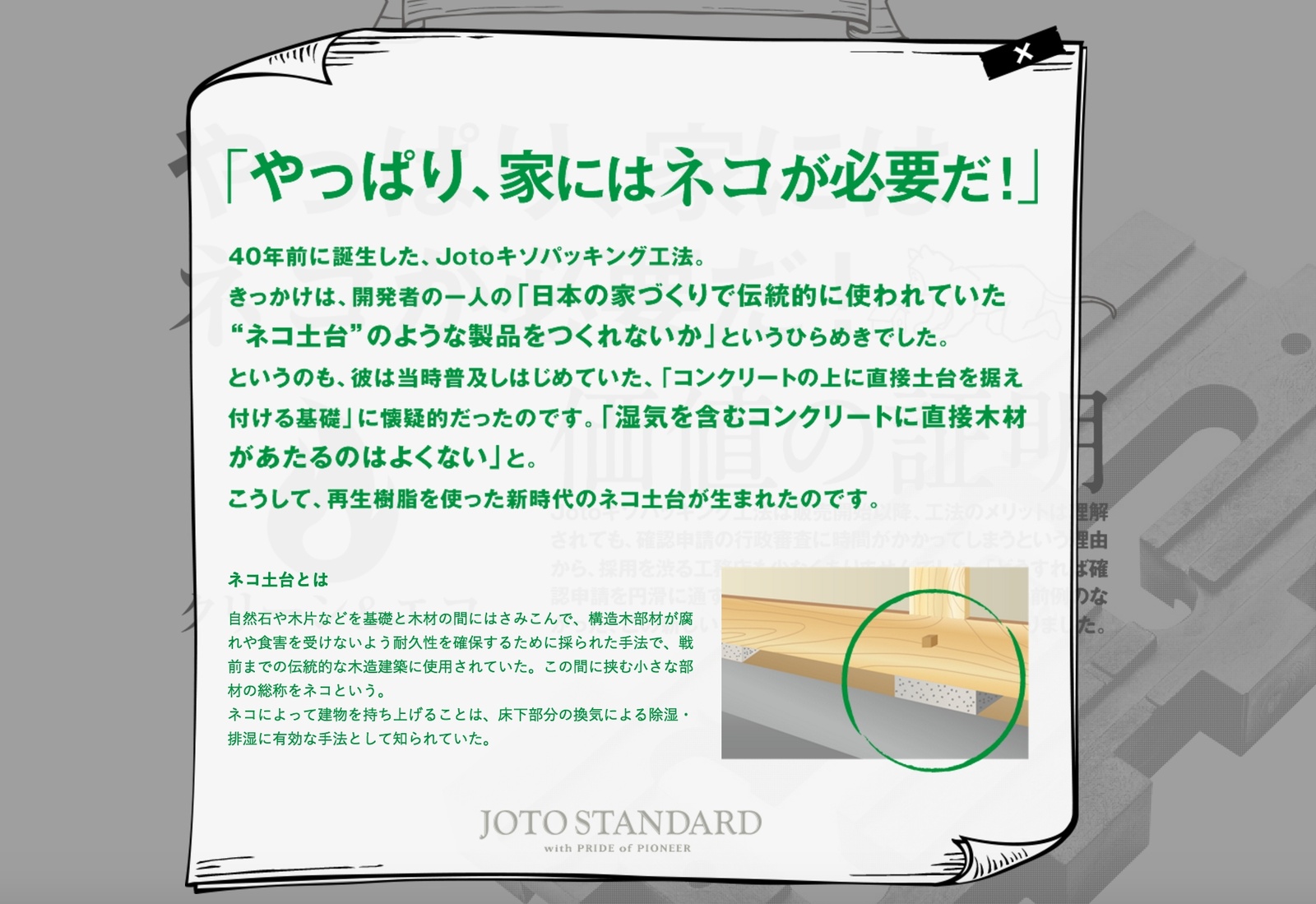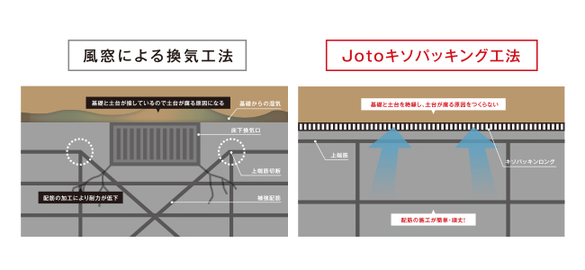 今では日本の木造住宅の約半数に使用されている(※)床下換気工法『Jotoキソパッキング工法』。 今年、 工法確立40周年を迎え、 7月には累計施工実績400万棟を突破いたしました。 それを記念して『Jotoキソパッキング工法』が日本の木造住宅造りのスタンダードとなっていった歴史をまとめた特設サイトを公開いたしました。