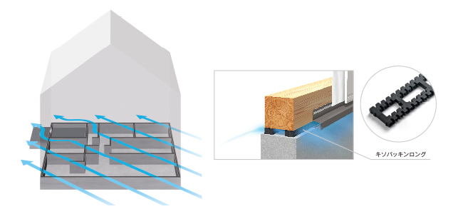 それまで基礎に風窓と呼ばれる四角い穴を開けて床下の換気をしていたのを、 キソパッキンを挟むことで建物全周にできる隙間から自然の空気をまんべんなく取り込み、 全周換気を行うことで効率的な床下換気を実現。 全周換気で床下の湿気を室外に効率よく排出するだけでなく、 基礎に穴を開けないことで、 基礎の強度も高くなりました。