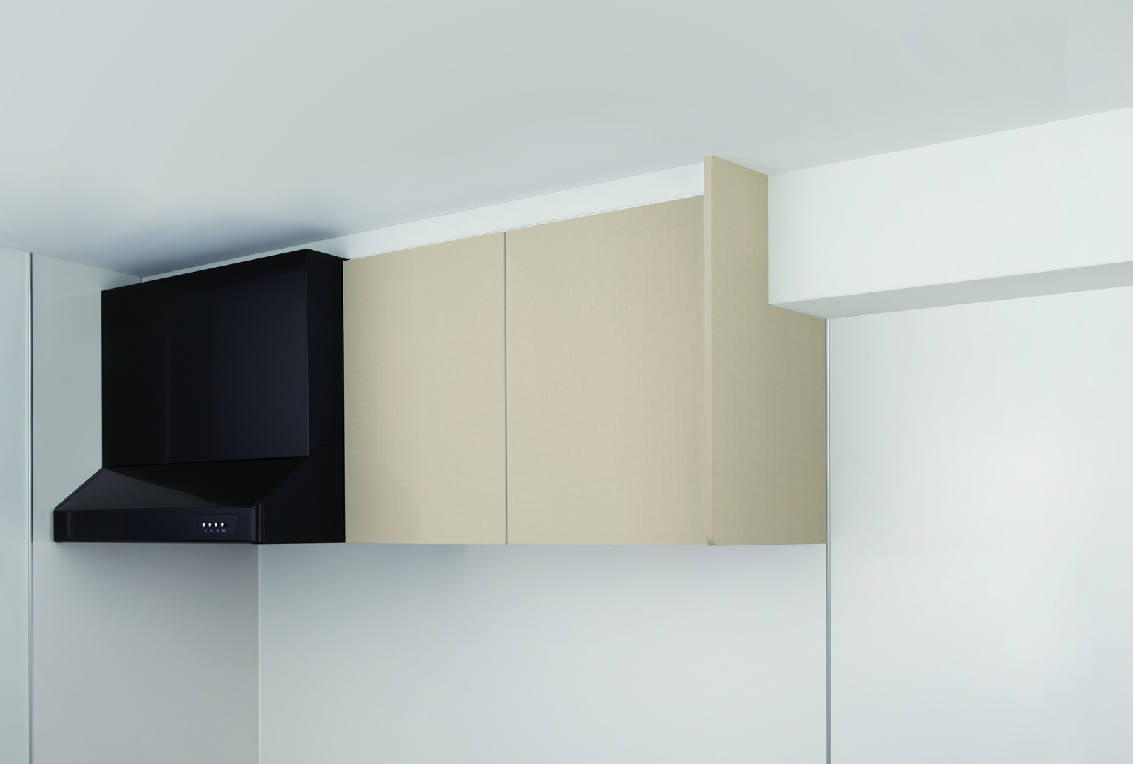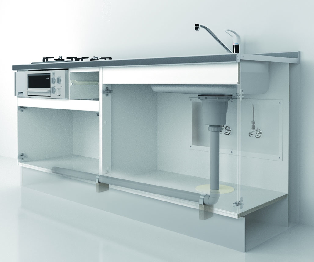 ベースキャビネット奥行寸法を60cmとしていますので、 従来の「流し台」からのリフォームが簡単です。 既設の設備配管との取り合いを考え、 ベースキャビネット蹴込部に高さ15cmの配管スペースを設けています。 また建物の梁にも対応する吊戸棚やキッチンフードも用意いたしました。