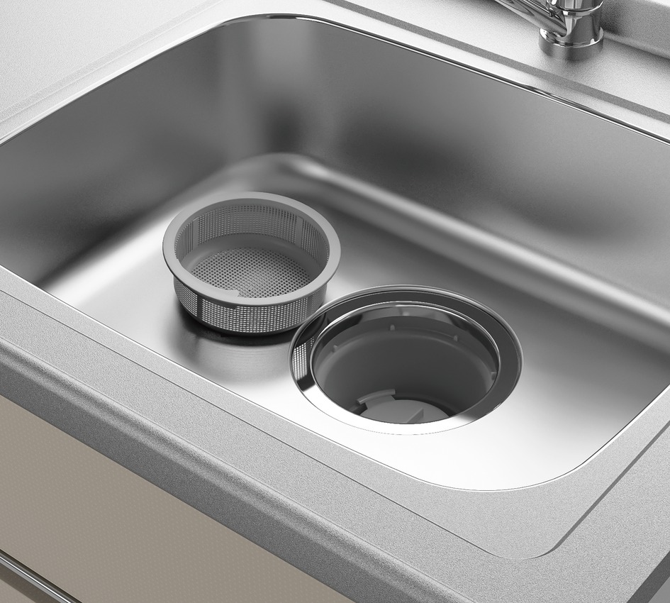 間口120cmから165cmのサイズに45cm幅(従来シリーズは32cm)、 排水口径18cmのシンクを搭載しました。 排水口には毎日のお手入れが楽な浅型ゴミカゴを標準装備いたしました。