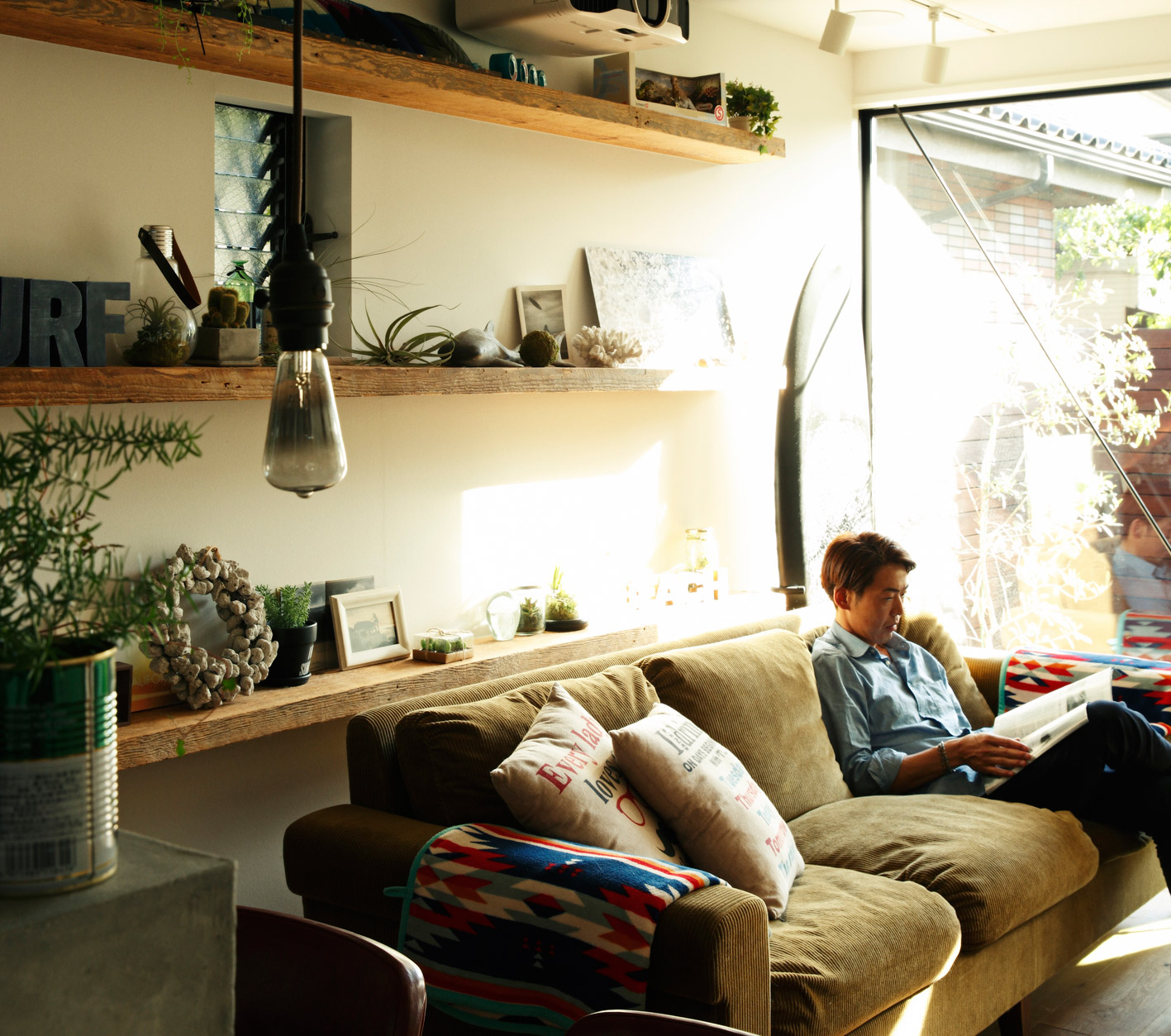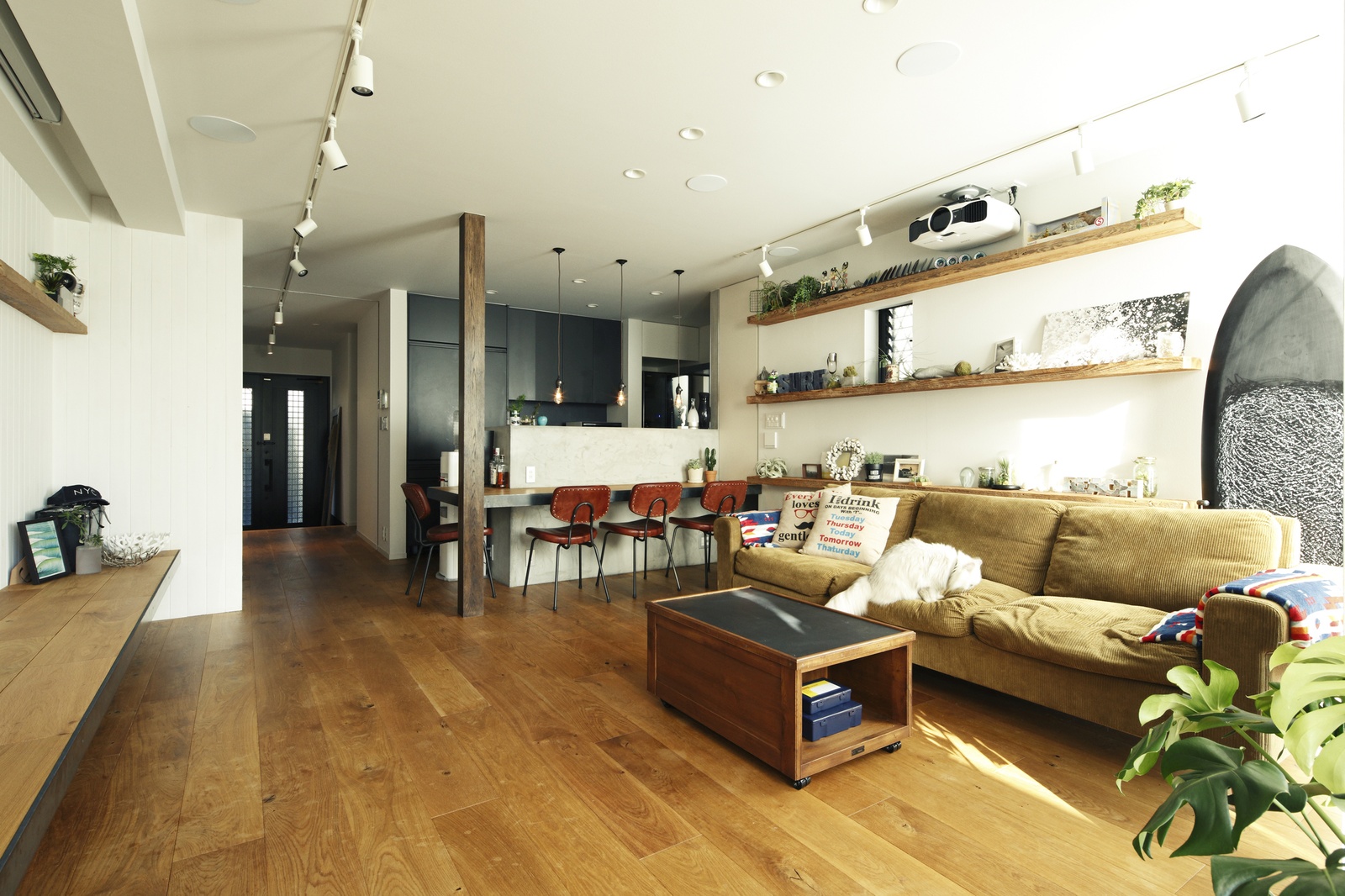 サーフィンがお好きだというお施主さま。 家族でくつろげるように、 物置となっていた和室を取り込み、 LDKを拡大しました。 暗かったLDKに自然光がたっぷりと注ぐように、 リビングに窓を大きく開口。 夏のさわやかな海の家を思わせる白の羽目板の壁。 ヨーロピアンオーク、 古材、 黒皮鉄、 モルタルなど、 くつろいだ感じの素材を使ったリノベーションで、 西海岸を感じる空間に生まれ変わりました。 履き込んでクタクタになったジーンズのように暮らしになじむ、 カリフォルニアスタイルの住まいです。