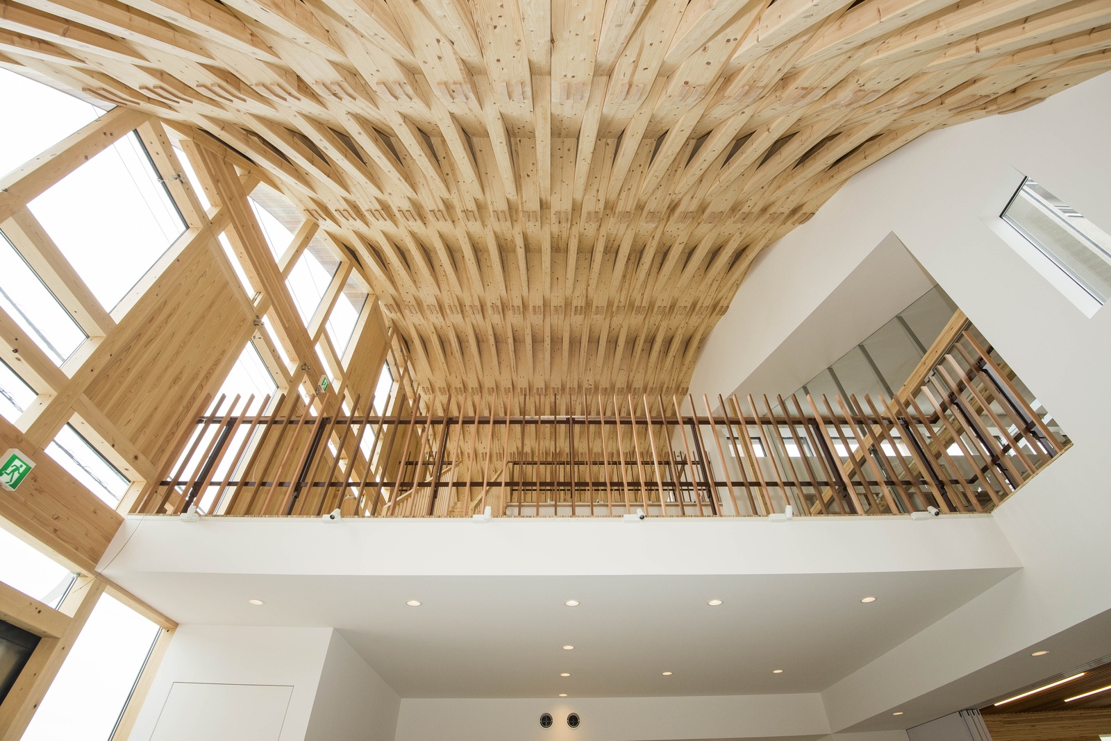「中大規模木造建築普及プロトタイプ」は、 シザーストラスアーチによる、 間口16m、 奥行き6m、 高さ9.7mの大空間を実現した3層構造の中大規模木造建築物です。 学識者、 地場ゼネコン、 鉄工所、 板金職人、 プレカット会社などの協力者とのコラボレーションによりこれを実現しています。 基本的に一般流通木材、 一般加工技術を用いるため、 建築コストの適正化を促進して広く普及を可能としています。 国産木材の活用による森林資源の活性化と住宅に限定されていた工務店参画の可能性を広げています。 大工の仕事・活動領域が広がることで、 高齢化により激減する大工人口の改善にもつながると考えます。