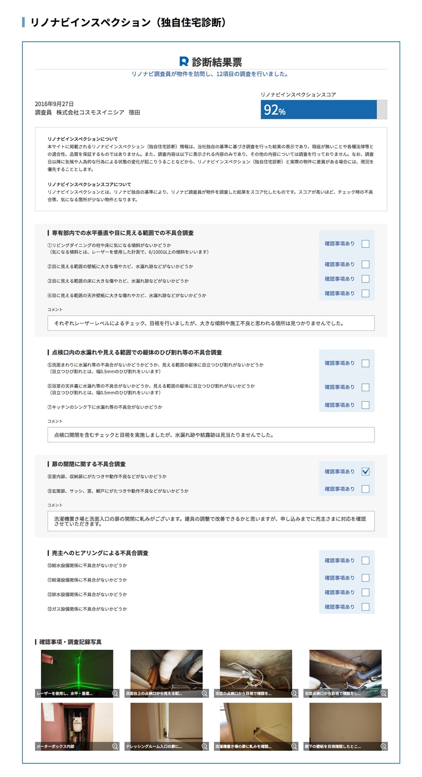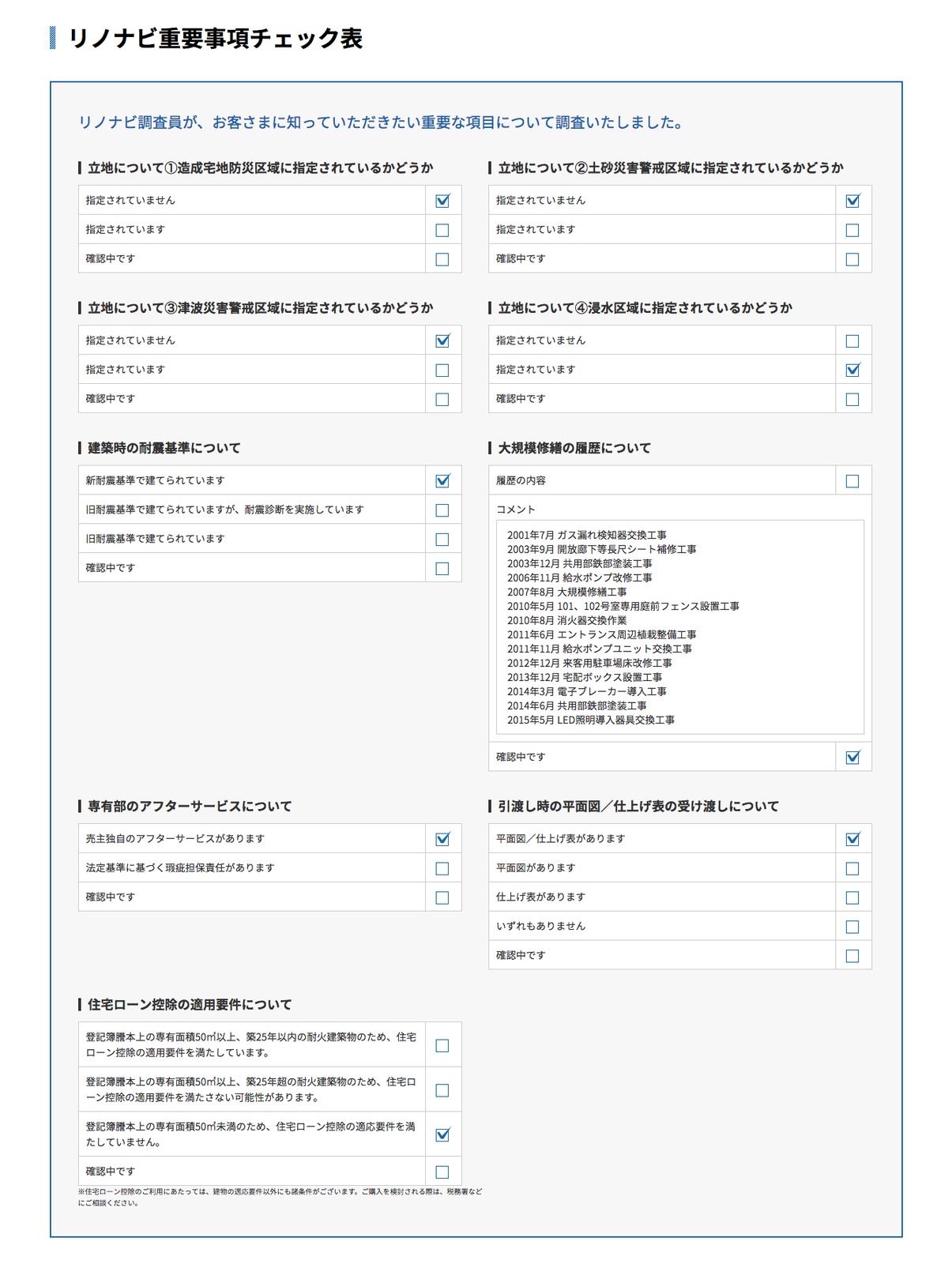 - 独自の住宅診断調査(リノナビインスペクション)による現状や不具合の有無に関する情報