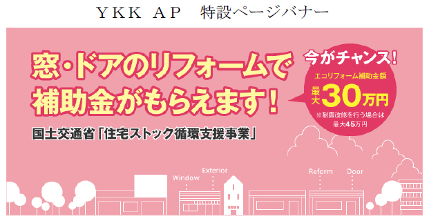 YKK AP株式会社(本社:東京都千代田区、 社長:堀 秀充)は、 平成28年度第2次補正予算措置で導入される国土交通省の「住宅ストック循環支援事業」におけるエコリフォーム補助制度が11月1日から本格化するのに合わせ、 独自のキャンペーン「ダブル!!キャンペーン」を11月21日から実施することで、 窓・ドアリフォームの提案強化を更に進めます。