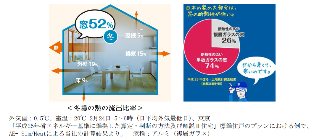 日本の従来仕様の住宅において、 冬場の室内からの熱の流出で最も多い部位は、 実は「窓」で全体の約5割を占めます。 ところが、 日本の家の多くは窓の断熱性能が低く、 日本の住宅の約4分の3が断熱性能の低い単板(1枚)ガラスの窓 という統計もあります。