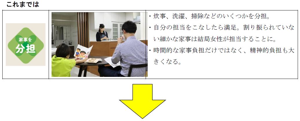 「家事シェアハウス」では、 家族全員が家事を自分のこととして認識し、 積極的に取り組めるための多くのアイデアを提案します。