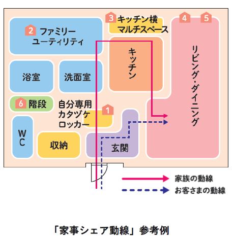 そこで、 帰宅してリビングでくつろぐまでに、 身の回りのものを所定の位置に片付けられる「家事シェア動線」を提案します。