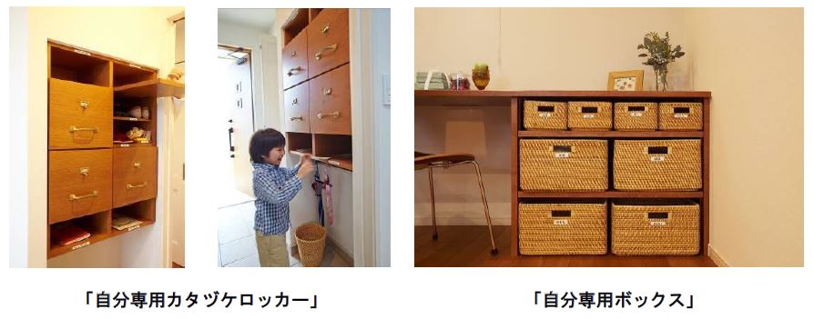家族それぞれの荷物を各自が個別管理できるよう玄関に「自分専用カタヅケロッカー」を設置します。 靴やスリッパ、 毎日使う小物を収納したり、 郵便物を仕分けして、 リビングに余計なものを持ち込まないようにします。 また、 散らかりがちなリビング・ダイニングにも「自分専用ボックス」を設け、 雑誌や美容グッズ、 勉強道具など、 それぞれのモノを自分のボックスにしまえるようにしました。