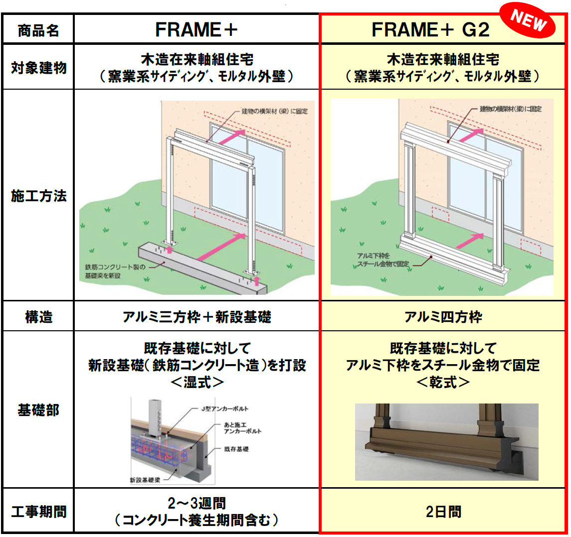 新商品「フレームプラス G2」は、 「フレームプラス」の基本コンセプトをそのままに、 工法の簡略化を図ることで、 生活者の負担を更に軽減します。 窓のまわりを囲う 「コンクリート工事不要のアルミ四方枠耐震フレーム」を業界で初めて採用(特許申請中)して施工を簡略化 したことで、 施工期間の大幅な短縮(2~3週間 → 2日)と工事費用(材料費+施工費)の約3割削減 を実現します。