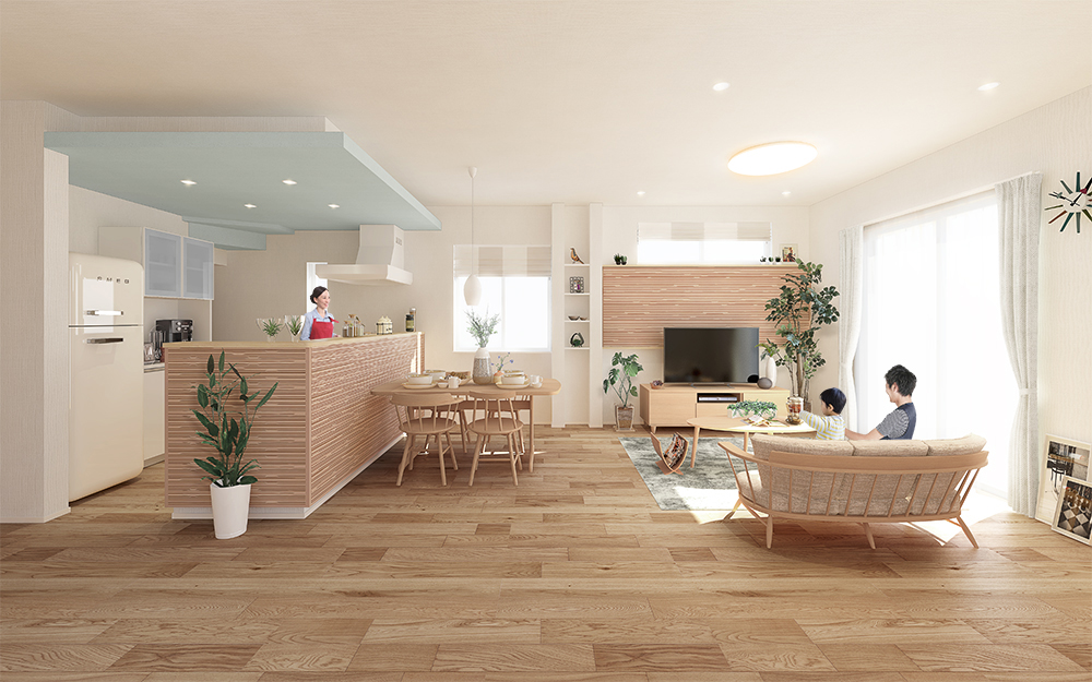 家族が自然な距離を保ちながら過ごせる空間。 そこに本物の杉や香りの手触りを楽しめる壁を施しました。